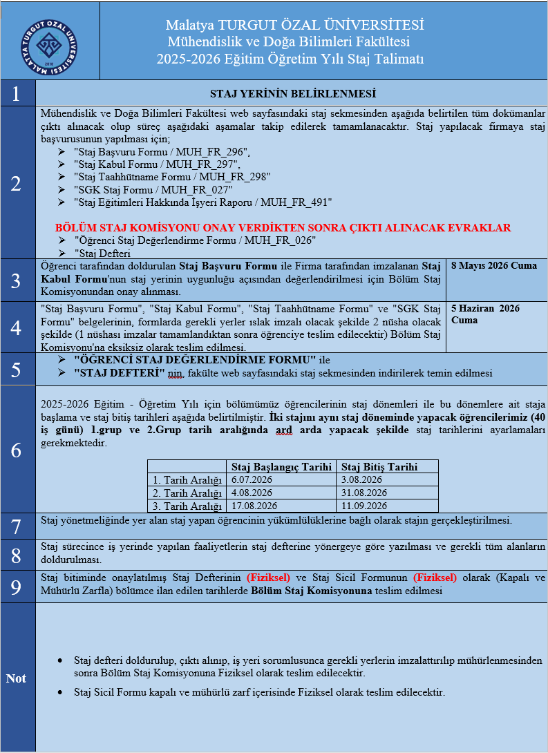 2025-2026 Eğitim-Öğretim yılı yaz dönemi staj tarihlerimiz ve staj sürecinde takip edilmesi gereken adımlar web sayfamızda ilgili sekmede belirtilmiştir. Staj yapacak öğrencilerimizin mağduriyet yaşamaması için takvime ve kurallara titizlikle uyması gerekmektedir.